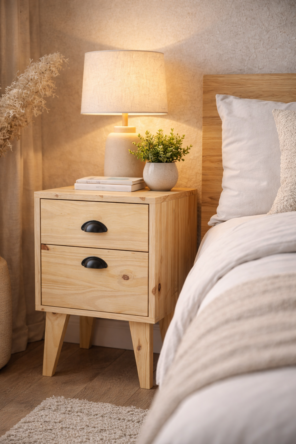 Juego de mesa de luz nordica de pino 18mm con cajon de 25cm de largo reforzado, cuenta con una puerta para guardar zapatos