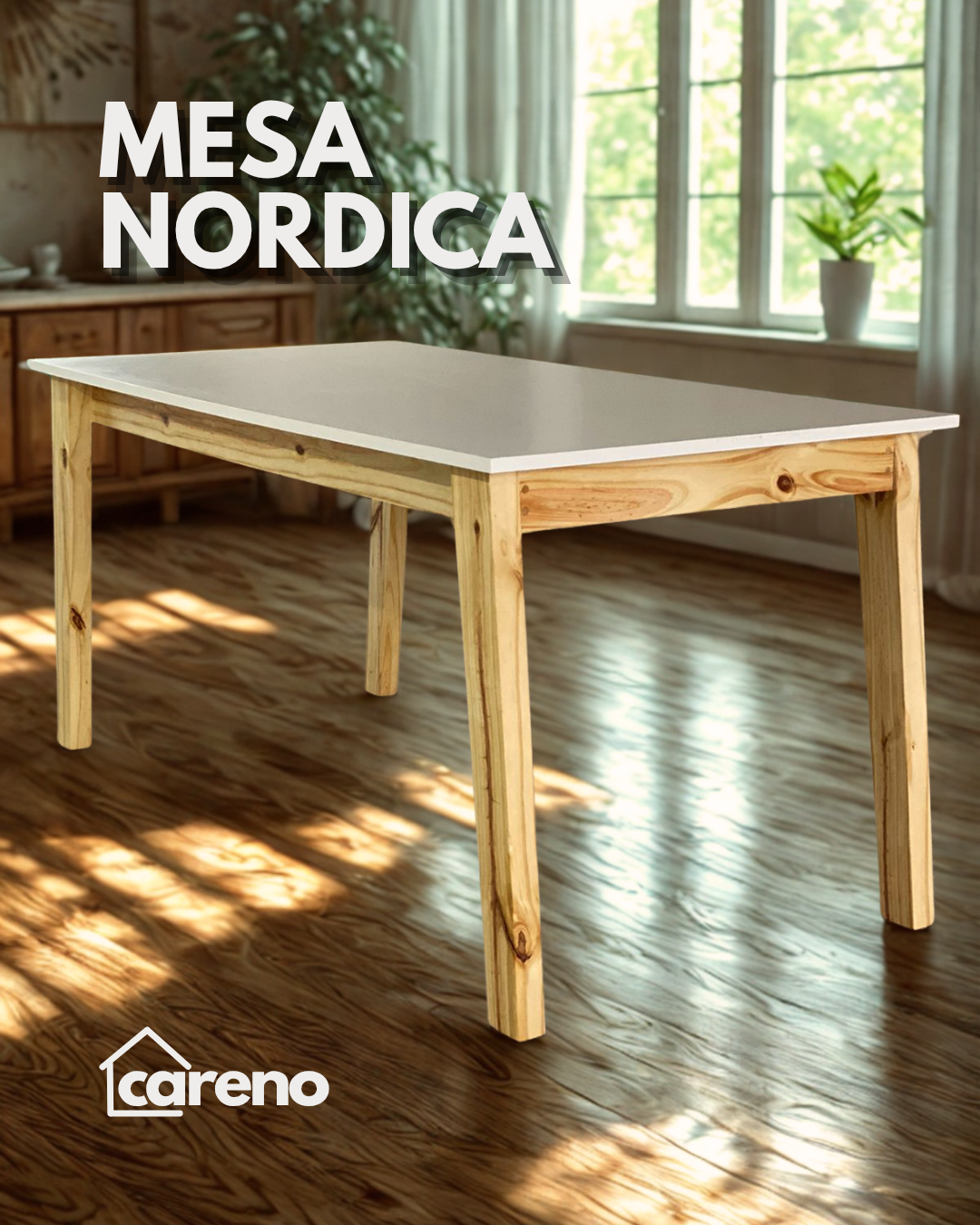 Mesa nórdica para 6 con estructura de pino elliottis y tapa de melamina blanca 18mm